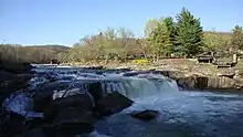 • Ohiopyle Falls is a 20-foot (6.1 m) waterfall that spans the Youghiogheny River and is surrounded by the Falls Day Use Area located at the center of the park.[4]