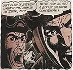 During the late 1950s and early 1960s a number of American painters began to adapt the imagery and motifs of comic strips. Lichtenstein made drawings of comic strip characters in 1958. Andy Warhol produced his earliest paintings using this style in 1960. Lichtenstein, unaware of Warhol's work, produced Look Mickey and Popeye in 1961.[1] Soon, Lichtenstein advanced from animated cartoons to more serious themes such as romance and combat depictions.[2] Lichtenstein said that at the time, "I was very excited about, and very interested in, the highly emotional content yet detached impersonal handling of love, hate, war, etc., in these cartoon images."[2] The work was inspired by five different comic book panels made by Russ Heath and Irv Novick.[3] The plane, the pilot, the text balloon and the graphic onomatopoeia, "VOOMP!", all come from panels from different comic books.[4]