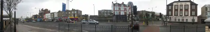 Unlike many places in London, the Old Kent Road area did not suffer significant bomb damage during World War II.[36] In 1968, a flyover opened at the northern end allowing access to New Kent Road which catered for the main flow of traffic.[37][38] During the 1970s, run-down Victorian properties on and around Old Kent Road were demolished to make way for new housing estates.[39] Burgess Park was created as part of the County of London Plan in 1943, which recommended new parkland in the area. Several tower blocks were built along the road, although some earlier 19th-century buildings, such as Nos. 360–386, survived.[40]
