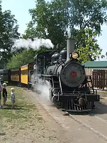 The Midwest Central Railroad operates a 3 ft (914 mm) narrow gauge railway around the reunion exhibit area. This railroad features a Class C Shay locomotive from the West Side Lumber Company railway. Other engines include two 2-6-0 Baldwin engines (one having a recently updated boiler and the other undergoing extensive rework) that formerly served logging railroads in the eastern United States and a German 0-4-0 built by Henschel & Son. For routine operations, there are two Plymouth Locomotive Works diesel switch engines, one of them run if there's something wrong with one of the two trains that run each day, and a Vulcan Iron Works gasoline switch engine.[6] [7] In addition to operating during the reunion, the Midwest Central Railroad has public events connected to Independence Day, Halloween and Christmas.[8]
