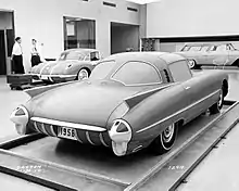 The Oldsmobile Golden Rocket was a two-seater[5] show car built by Oldsmobile for the 1956 General Motors Motorama. The radically styled fiberglass concept, designed to resemble a rocket on wheels, was revised several times and displayed at various other auto shows,[6] most notably at the 1957 Paris Motor Show where it generated much fanfare, 18 months after it was first revealed.[2] The car was featured in the promotional short film Design for Dreaming along with the rest of the 1956 General Motors lineup.[7]