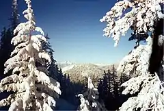 The Canada–United States border—with an official crossing into Osoyoos, British Columbia from Oroville—lies approximately 45 miles (72 km) to the north.[20] The Idaho border lies about 160 miles (260 km) southeast.[21] The state's largest city, Seattle, lies 237 miles (381 km) southwest of Omak.[22] The Okanogan River, coming out of the town of Riverside, defines the city's northern border, while the southern border is defined by the city of Okanogan; the terrain here is mountainous and forested.[23] The nearest primary statistical area is the Wenatchee – East Wenatchee metropolitan area.[24] A CDP located northeast of the city was named North Omak because of its proximity to Omak. It is part of two census county divisions: Omak (western half) and Colville Reservation (eastern half).[25][26]