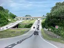In 1975, construction began on a westward extension of the Brantford Bypass, from Highway 2 (Paris Road) to Rest Acres Road, which would become Highway 24. This work consisted of the twin bridges over the Grand River and an interchange at Rest Acres Road. The Canadian National Railway underpass west of Highway 2 was built by the railway.[23] By the beginning of 1978, this work was completed.[49] Work resumed west of Highway 24 in early 1982 to connect with Highway 401 near Woodstock to relieve the high traffic volumes along Highway 2.[50] This included interchanges at Brant County Road 25 and Highway 53.[40] A section from Highway 24 to County Road 25 was opened in November 1984,[24] followed by the section west of there to Highway 53 one year later.[51] Construction of the gap between Highway 53 and Highway 401 began in late 1985,[52] followed by the Highway 401 overpass for the westbound lanes, which began in 1987.[16] Transportation minister Ed Fulton ceremoniously opened the new freeway connection on September 26, 1988, completing the Woodstock to Brantford link.[24]