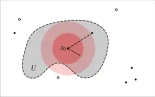 Black dots represent zeros of g(z). Black annuli represent poles. The boundary of the open set U is given by the dashed line. Note that all poles are exterior to the open set. The smaller red disk is B, centered at z0.