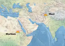 Four U.S. Navy ships and the submarine USS Columbia,[lower-alpha 7] stationed in the Arabian Sea,[60] fired between 60 and 75[lower-alpha 8] Tomahawk cruise missiles into Afghanistan at the Zhawar Kili Al-Badr camp complex in the Khost region, which included a base camp, a support camp, and four training camps.[93] Peter Bergen identifies the targeted camps, located in Afghanistan's "Pashtun belt,"[94] as al-Badr 1 and 2, al-Farooq, Khalid bin Walid, Abu Jindal, and Salman Farsi;[95] other sources identify the Muawia,[96][94] Jihad Wahl,[97] and Harkat-ul-Jihad al-Islami[50][98] camps as targets. According to Shelton, the base camp housed "storage, housing, training and administration facilities for the complex," while the support camp included weapons-storage facilities and managed the site's logistics.[93] Egyptian Islamic Jihad and the Algerian Armed Islamic Group also used the Khost camps, as well as Pakistani militant groups fighting an insurgency in Kashmir, such as Harkat Ansar, Lashkar-e-Taiba, and Hizbul Mujahideen.[93][99] The rudimentary camps, reputedly run by Taliban official Jalaluddin Haqqani,[100] were frequented by Arab, Chechen, and Central Asian militants, as well as the ISI.[101] The missiles hit at roughly 10:00 PM Khost time (17:30 GMT); as in Sudan, the strikes were launched at night to avoid collateral damage.[93] In contrast to the attack on Al-Shifa, the strike on the Afghan camps was uncontroversial.[102][103]