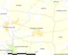 The Tyneside Scottish selected as a tank killing ground, an area east and south-east of ring contour 110, in front of A and B companies, which had the only good field of observation and dug in four 6-pounder anti-tank guns by the evening. Patrols were sent forward but discovered little because of the poor view in the bocage.[34] The 11th RSF held the right flank near Juvigny, in touch with the 50th Division to the west and the 1/4th KOYLI to the east, who were at the western edge of Tessel Wood. The Hallamshires held the south-west corner of the wood, a little to the north of Vendes and linked with the 4th Lincolns at Tessel-Bretteville. The 11th DLI were dug in near Rauray and linked with the Tyneside Scottish on the high ground at ring contour 110.[35] Across the divisional and corps boundary to the east, along the road to le Haut du Bosq, the 6th King's Own Scottish Borderers (6th KOSB) of the 15th (Scottish) Division were dug in on the south side of the road, an obvious avenue of attack against VIII Corps. Only the units near ring contour 110 had a relatively unhampered view, the other battalions being hemmed in by banks, hedgerows and trees.[35] The three 49th Division artillery regiments, tanks of the 24th Lancers, anti-tank guns of the 217th Anti-tank Regiment RA, two dummy 6-pounder anti-tank guns and the Vickers machine-guns of the 2nd Kensingtons, were made ready to support of the infantry.[36] Wireless intelligence, gleaned from the II SS Panzerkorps, led to Bomber Command dropping 1,300 long tons (1,300 t) of bombs during the evening on suspected German tank concentrations at Villers-Bocage which, along with a naval and artillery bombardment, obliterated the town in twelve minutes.[37]