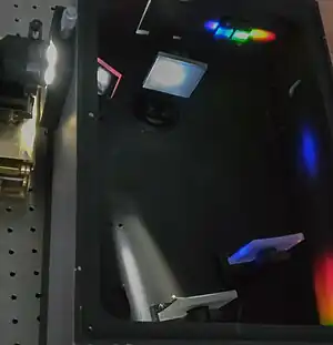 Spectroscopes are often used in astronomy and some branches of chemistry. Early spectroscopes were simply prisms with graduations marking wavelengths of light. Modern spectroscopes generally use a diffraction grating, a movable slit, and some kind of photodetector, all automated and controlled by a computer. Recent advances have seen increasing reliance of computational algorithms in a range of miniaturised spectrometers without diffraction gratings, for example, through the use of quantum dot-based filter arrays on to a CCD chip[3] or a series of photodetectors realised on a single nanostructure.[4]