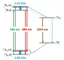 The energy level structure of the NV− consists of a triplet ground state, a triplet excited state and two singlet states. Under resonant optical excitation, the NV may be raised from the triplet ground state to the triplet excited state. The centre may then return to the ground state via two routes; by the emission of a photon of 637 nm in the zero phonon line (ZPL) (or longer wavelength from the phonon sideband) or alternatively via the aforementioned singlet states through intersystem crossing and the emission of a 1042 nm photon. A return to the ground state via the latter route will preferentially result in the state.
