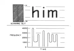 Tone generating method of the FM-SLIT reading machine (above), and Frequency-time plot of its output (below).