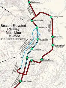 Following a 1928 accident at a tight curve on Beach Street, the southern portion of the Atlantic Avenue Elevated, between South Station and Tower D on Washington Street, was closed (except for rush-hour trips from Dudley to North Station via the Elevated), breaking the loop; non-rush-hour Atlantic Avenue service was reduced to a shuttle between North and South Stations.[3] In 1938, the remainder of the Atlantic Avenue Elevated was closed, leaving the subway as the only route through downtown – what is now the Orange Line between Haymarket and Chinatown stations.