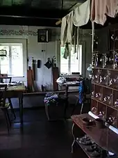 In a room that had been furnished in the manner of an old Ore Mountain parlour were displayed a painted four-poster bed (1764), a huge chest (1734), a chest with a lid painted on the inside (1785), a colourful wardrobe covered with flowers (1798), a giant farmer's table with a tabletop of valuable wood, stone items, guild tankards, glasses and other household items. On the table stood a might clay pitcher (1739), a tin lamp (Gockel-Lampe) and an open family bible. The whole was completed by a wood-shaving candlestick (Spanleuchter) with wooden shavings. After a tour visitors could buy a "miniature farmhouse room with a stove in a matchbox" at the counter.