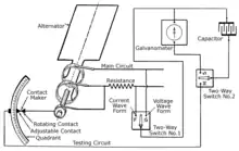 This process was first partially automated by Jules François Joubert with his step-by-step method of wave form measurement. This consisted of a special single-contact commutator attached to the shaft of a spinning rotor. The contact point could be moved around the rotor following a precise degree indicator scale and the output appearing on a galvanometer, to be hand-graphed by the technician.[2] This process could only produce a very rough waveform approximation since it was formed over a period of several thousand wave cycles, but it was the first step in the science of waveform imaging.