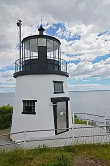 The town of Owls Head is located south of Rockland, and includes an eponymous peninsula that projects northeast into Penobscot Bay, with its tip roughly east of downtown Rockland. The light station is located at the eastern tip of this peninsula. The light station was established in 1825 with the construction of a round, rubblestone tower by Jeremiah Berry and Green & Foster.[8] The tower was rebuilt in 1852.[9] It is a 30-foot-tall (9.1 m) cylindrical brick tower on a granite foundation standing on top a cliff. It has one of the last six Fresnel lenses in operation in Maine.[2] The light is located 100 feet (30 m) above mean sea level.[8]