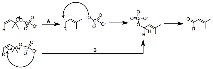 An important process mediated by chromium(VI)-amines is the oxidative transposition of tertiary allylic alcohols to give enones.[6] The mechanism of this process likely depends on the acidity of the chromium reagent. Acidic reagents such as PCC may cause ionization and recombination of the chromate ester (path A), while the basic reagents (Collins) likely undergo direct allylic transposition via sigmatropic rearrangement (path B).