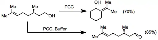 Buffering agents may be used to prevent acid-labile protecting groups from being removed during chromium(VI)-amine oxidations. However, buffers will also slow down oxidative cyclizations, leading to selective oxidation of alcohols over any other sort of oxidative transformation. Citronellol, for instance, which cyclizes to pugellols in the presence of PCC, does not undergo cyclization when buffers are used.[9][10]