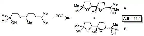 Oxidative cyclizations of olefinic alcohols to cyclic ethers may occur via [3+2], [2+2],[7] or epoxidation mechanisms. Insights into the mechanism is provided by structure-reactivity, implicating direct epoxidation by the chromate ester.[8] Subsequent epoxide opening and release of chromium leads to the observed products.