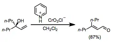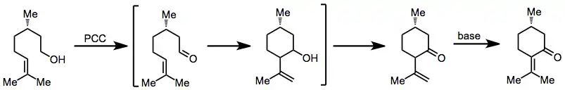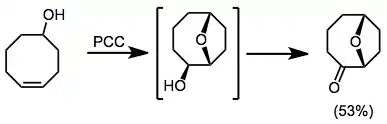Oxidative annulation of alkenols to form six-membered rings may be accomplished with PCC. This process is postulated to occur via initial oxidation of the alcohol, attack of the alkene on the new carbonyl, then re-oxidation to a ketone. Double-bond isomerization may occur upon treatment with base as shown in equation (3) below.[5]
