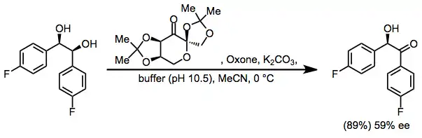 Enantioselective dioxirane oxidations may rely on chiral, non-racemic dioxiranes, such as Shi's fructose-based dioxirane. Enantioselective oxidation of meso-diols with Shi's catalyst, for instance, produces chiral α-hydroxy ketones with moderate enantioselectivity.[8]