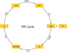PIP2 cycle involves steps of chemical reactions characterized by various enzymes. First hydrolysis of PIP2 molecules by activated phospholipase C leads to formation of diacylglycerol and inositol trisphosphate. These two are themselves important second messengers.[4] Diacylglycerol further converted into phosphatidic acid (PA) by DAGK enzyme. Furthermore, CDP-diacylglycerol synthetase uses CTP to create cytidine diphosphate diacylglycerol from PA.[5][6] Generated CDP-DAG then condensed to PI by phosphatidylinositol synthase.[7] This PI is then phosphorylated to PI4P and back to PIP2 via action of PI4K and PIP5K[8]