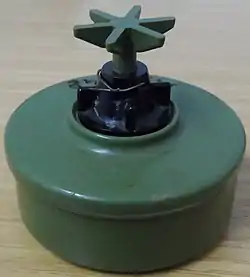 The PMA-2 is a Yugoslavian blast antipersonnel mine. Sometimes referred to as the 'Pašteta', due to its superficial resemblance to a meat-pâté tin. The mine is constructed from dark green plastic, with a distinctive plunger which has six petals radiating from it.