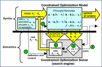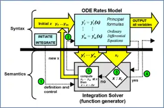 Yet semantically, this mathematical blending was considerably more complex than the mechanics of subroutines because an iterative solution engine was attached to each problem model by its calling operator template above it in the program hierarchy. In its numerical solution process, this engine would take control and would call the problem model subroutine iteratively, not returning to the calling template until its system problem was solved. During some or maybe all of the iterative model-subroutine calls, the engine would invoke automatic differentiation of the formulas in the model holarchy with respect to the model's input-unknowns (arguments) defined in the calling template. Additional mechanisms were performed in the semantics to accommodate ubiquitous nesting of these holistic models.