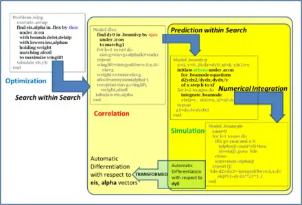 The two outer holons each has a hidden coordinate system of unknowns that its search engine solves for. And these engines require partial derivatives of all downstream variables dependent upon those unknowns, which are evaluated by automatic differentiation arithmetic. The derivatives of the outer coordinate system must be computed from the derivatives of the inner coordinate system, after the inner search engine has converged (found a local solution). This is where a differential-geometry coordinate transformation is applied. The wing problem of Figure 2 has more downstream subprograms, not shown, including an integral quadrature function.