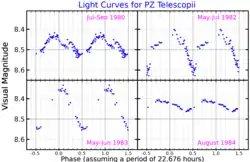 Visual band light curves for PZ Telescopii, adapted from Innis et al. (1990)[1]