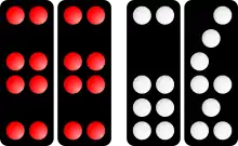The double-one tiles and double-six tiles are known as the Day and Teen tiles, respectively. The combination of a Day or Teen with a nine (Gow, 5-4 or 6-3) creates a Wong, worth 11 points, while putting either of them with an eight (either Yun, 4-4; or Bot, 5-3 or 6-2) results in a Gong, worth 10. Gongs and Wongs formed with a Teen tile are ranked higher than those formed with a Day tile.[8]