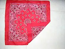 Bandanas (Bandhani) originate in India and found popularity in the US during the late 1700s because snuff users preferred the coloured and patterned silk handkerchiefs due to their improved ability to hide the tobacco stains when they blew their noses over white cotton. The paisley pattern first appeared on European made bandanas in the early 1800s and the patterns were imitations of Kashmir shawls.[23] In the late 18th and early 19th centuries, bandanas began to appear with political and military advertisements printed on them.[23] Such printed bandanas were common during the early and mid- 1900s when World War I and World War II were being fought. It was thought that by purchasing and sporting a pro-war paisley bandana the buyer was helping to support their country in winning the war. The paisley bandana started to feature in Western movies and thus became a symbol of the American West.