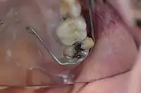 Buccal view of an interim palatal lift prosthesis master cast with an orthodontic wire clasp bent to engage an orthodontic bracket affixed to tooth number 15