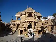 The Adishvara Temple, dated to the 16th century, has an ornamented spire; its main image is that of Rishabha. The Chaumukh temple, built in 1616 by Setthi Devaraj, has a four-faced Adinatha image deified on a white pedestal, each face turned towards the cardinal directions. The west-side of the shrine is surrounded by Veranda with richly carved pillars and figures of musicians and dancers. There are two sub-shrines dedicated to Gomukha and Chakreshvari near the main entrance.[38]