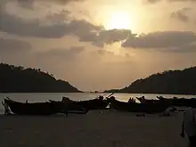 Palolem Beach is largely unspoiled and is inhabited by both local fishermen and by foreign tourists who live in shacks along the shore or in the main village itself.[1] It is about one mile (approximately 1.61 km) long and is crescent-shaped; one can view the entire beach from either end. Both ends of the beach consist of rocks jutting out into the sea. The depth of the sea increases gradually, being shallowest at the northern end of the beach, making it safe for average swimmers, and the currents are not fast.