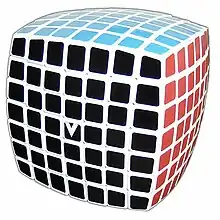 V-Cube is a brand name owned by Verdes Innovations, a company owned by Panagiotis. The V-Cube brand is used to sell puzzles that are similar to the original Rubik's Cube. The brand is known for being the first to mass-produce the first ever 6x6x6 and 7x7x7 puzzles,[2] and for being the first to create a design that would allow for puzzles up to the 11x11x11.[1] Prior to Verdes' invention, the 6x6x6 cube was thought to be impossible due to geometry constraints. Verdes's invention uses a completely different mechanism than the smaller Rubik's cubes; his mechanism is based on concentric, right-angle conical surfaces whose axes of rotation coincide with the semi-axes of the cube.[1] The patents for the cubes were awarded in 2004, and mass-production began in 2008.