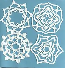 A paper snowflake is a type of paper craft based on a snowflake that combines origami with papercutting. The designs can vary significantly after doing mandatory folding.[1]