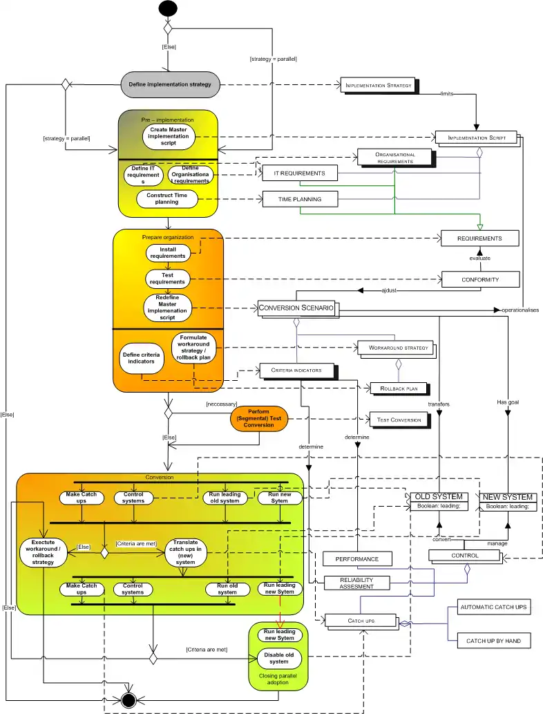 Conversion scenario The redefined implementation script, taking into account the conformity to the requirements. Furthermore the conversion scenario consists of a workaround and rollback plan. The conversion scenario is the blueprint of the implementation project. (Rooijmans, 2003)