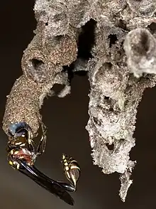 P. mellyi nests are known for their distinct combs at different levels of suspension.[5] It builds nests with materials from three main sources: vegetation close to the nest, materials stolen from abandoned or occupied neighboring nests, and material removed from one cell, which is then used to start to enlarge a cell in the other part of the nest.[5] Such recycling of the materials of the cells is frequently observed. A brand new cell is only built when there is no cell to shelter an anticipated egg.[5] Material used for nest development has two important features: the cuticular cell layer of plants constitutes a substantial portion of the nest, and the texture of the nest material is of fine crumbs and small flakes.[5] This kind of fragile aspect of the nest material might explain the low occurrence of large nests, and this may possibly hinder the evolution of large colony size.[1][5] Its nesting structure is known for its flexibility, and thus lacks a typical shape or form.[5] First off, cells modify its size with the changing size of the larva as it grows: the cell goes through a phase of regression until the cell size is equivalent to that of the growing larva.[5] Then, both the larva and the cell starts to grow again in a similar fashion. Additionally, there is a general trend of decrease percent cell wall sharing with increase in suspension length.[5] Typically, the nests are located on the strands of dead vegetation such as hanging vine tendrils or loose strands of thatch under the roofs of houses. The mean total suspension length of these nests is 18.4 cm and the mean suspension width is 0.64mm.[5] The long and narrow shape of the nest also provides protection from predators.[5]