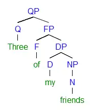 Syntactic tree of English partitive "Three of my friends" under a quantifier-based approach. Note that in a partitive, the noun is embedded in a DP and the preposition of is a functional element, i.e., without lexical content.