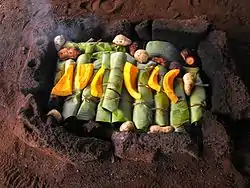 ![]() A Pascuense umu, meat and vegetables roasted in an earth oven. | |