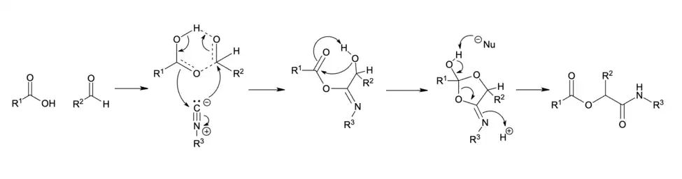 The Passerini reaction is a chemical reaction involving an isocyanide, an aldehyde (or ketone), and a carboxylic acid to form a α-acyloxy amide.[1][2][3][4][5] This addition reaction is one of the oldest isocyanide-based multicomponent reactions and was first described in 1921 by Mario Passerini in Florence, Italy.[6][7] It is typically carried out in aprotic solvents but can also be performed in ionic liquids such as water or deep eutectic solvents.[7] It is a third order reaction; first order in each of the reactants. The Passerini reaction is often used in combinatorial and medicinal chemistry with recent utility in green chemistry and polymer chemistry.[6][8][9] As isocyanides exhibit high functional group tolerance, chemoselectivity, regioselectivity, and stereoselectivity, the Passerini reaction has a wide range of synthetic applications.[6][10][11][12]