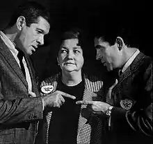 Photo of guest stars Jan Murray, Patsy Kelly and Pat Harrington from the television program The Man From U.N.C.L.E.. The three play roles of THRUSH executives jockeying for power in the organization in the episode "The Hula Doll Affair".