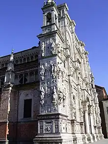 The façade of the church is famous for its exuberant decorations, typical of Lombard architecture, every part being decorated with reliefs, inlaid marble and statues. Sculptors who worked on it include Cristoforo Mantegazza and Giovanni Antonio Amadeo himself and Benedetto Briosco. In addition to applied sculpture, the facade itself has a rich sculptural quality because of the contrast between richly textured surfaces, projecting buttresses, horizontal courses and arched openings, some of which are shadowed, while those in the small belfries are open to the sky. The façade, created by superimposing simple rectangles, is loaded with decorations, a typical procedure of Lombard Renaissance architecture and is made of Carrara marble and to a lesser extent Candoglia marble, stone of Varenna, Saltrio stone and Egyptian red porphyry (probably derived from architectural finds from the Roman age).[12][13][14][15]