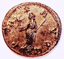 Pax (Latin for Peace), more commonly known in English as Peace, was the Roman goddess of peace derived and adopted from the ancient Greek equivalent Eirene.[1] Pax was seen as the daughter of the Roman king god Jupiter and the goddess Justice. Worship of Peace was organized and made popular during the rule of the emperor Augustus who used her imagery to help stabilise the empire after the years of turmoil and civil war of the late republic.[2] Augustus commissioned an altar of peace in her honour on the Campus Martius called Ara Pacis,[3] and the emperor Vespasian built a temple for her on called the Templum Pacis. Pax had a festival held for her on January 30.[4][5] In art she is commonly depicted holding out olive branches as a peace offering, as well as a caduceus, cornucopia, corn and a sceptre.[6] Pax is also often associated with spring.