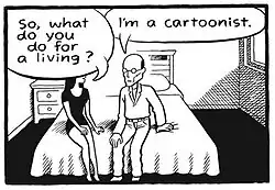 Between his encounters with prostitutes are scenes of himself discussing and debating the issue with his friends, especially fellow cartoonists Seth and Joe Matt. Much of the humour in the book comes from the dialogue in these scenes.[9]
