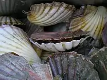 Pecten novaezelandiae is completely free-living, mobile and somewhat migratory.[2] The two valves are asymmetric. The left valve is convex while the right is flat. The concave valve has approximately 16 ribs.[2] The colour is variable, however the valves are usually a whitish pink, but sometimes can be a dark reddish brown. Natural predators are sea stars and octopus.[3]