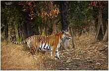 Collarwali, a daughter of Badi Mada, starred with her mother in the BBC Wildlife Special Tiger: Spy in the Jungle, which popularised the reserve.[15][16] She became one of India's best known tigers, giving birth to 26 cubs in 7 litters as of April 2017[14] and 29 cubs in 8 litters by her death in January 2022 at the age of 16.[15] Born in 2005 and initially dubbed T-15, she acquired the name Collarwali ('The One With a Collar') after being the first tigress in the park fitted with a radio collar, in 2008. She was unusually large for a female and because she was comparatively friendly, was the most frequently seen tiger in the park. In 2010 she gave birth to an unusually large litter, 5 cubs.[15] Of Collarwali's cubs, records indicate 14 of the 18 born by 2013[16] and 17 of the 22 from her first 6 litters survived to adulthood.[14] They have dispersed to other parts of Pench and some may have crossed over to other tiger reserves such as Kanha National Park. For example in December 2010,male T-39, born in her second litter in October 2008, travelled more than 50 km to near the boundary of the reserve.[17] She died in January 2022 and was cremated by a local tribal leader.[18][19]