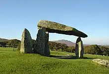Pentre Ifan (literally "Evan's Village") is the name of an ancient manor in the community and parish of Nevern, Pembrokeshire, Wales. It is 11 miles (18 km) from Cardigan, Ceredigion, and 3 miles (4.8 km) east of Newport, Pembrokeshire. Pentre Ifan contains and gives its name to the largest and best preserved neolithic dolmen in Wales.
