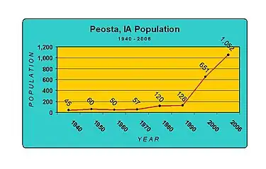 Peosta is a city in Dubuque County, Iowa, United States, and an exurb of the city of Dubuque. It is part of the Dubuque, Iowa Metropolitan Statistical Area. The population was 1,908 in the 2020 census, an increase of 193% from 651 in 2000.[2] Peosta experienced a 70% increase in population (estimated) from 2000 to 2007, making it the state's 10th fastest-growing city during that period.[3] Peosta is currently the sixth-largest city in Dubuque County, but it will likely soon pass Epworth (pop. 1,860) to become the fifth-largest. The community is home to the 2015 ASA D Northern Nationals Men's Slow Pitch Champions, Kass & Company, a large industrial park, the largest campus of Northeast Iowa Community College, and a handful of new commercial businesses. However, the city is increasingly becoming a bedroom community, much like nearby Asbury, made up of suburban subdivisions.