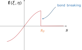 If the graph of versus bond stretching is plotted, the action of bond braking function in fracture formation is clear. However not only abrupt fracture can be modeled in peridynamic framework and more general expression for can be employed.[7]