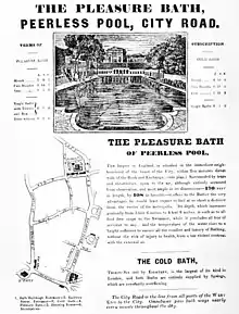In 1743 the pond was purchased by William Kemp, a jeweller, who developed it by enclosing it in stone edging and adding marble steps and a gravel bottom. He built a separate pond for fishing and renamed the site the more enticing Peerless Pool. The grounds were screened by trees and the pool was used as an ice rink in winter. Kemp imposed an annual admission charge of £1 10s. (or 1s. for day visitors).[1] The pool was 170 ft long x 108 ft wide and from 3–5 feet deep. It was London's first outdoor public swimming pool.