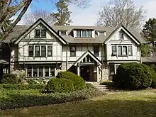 The home on the former nursery property was built in 1910 by Herbert C. Wise, a noted Philadelphia architect, as a wedding gift to Dudley and Alice Perkins.[4] The home, named by the family as Evergreen Lawn, is built in the Tudor Revival style inspired by English manor homes of the 15th and 16th centuries. The front porch tie beam is inscribed "D&AP 1910", for Dudley and Alice Perkins and the date the house was built. At or around 1930, the carriage house was built in the Craftsman style, the lower level served as a garage and the upper level an apartment. The same year, the second level porch at the original home was enclosed into a sleeping porch.